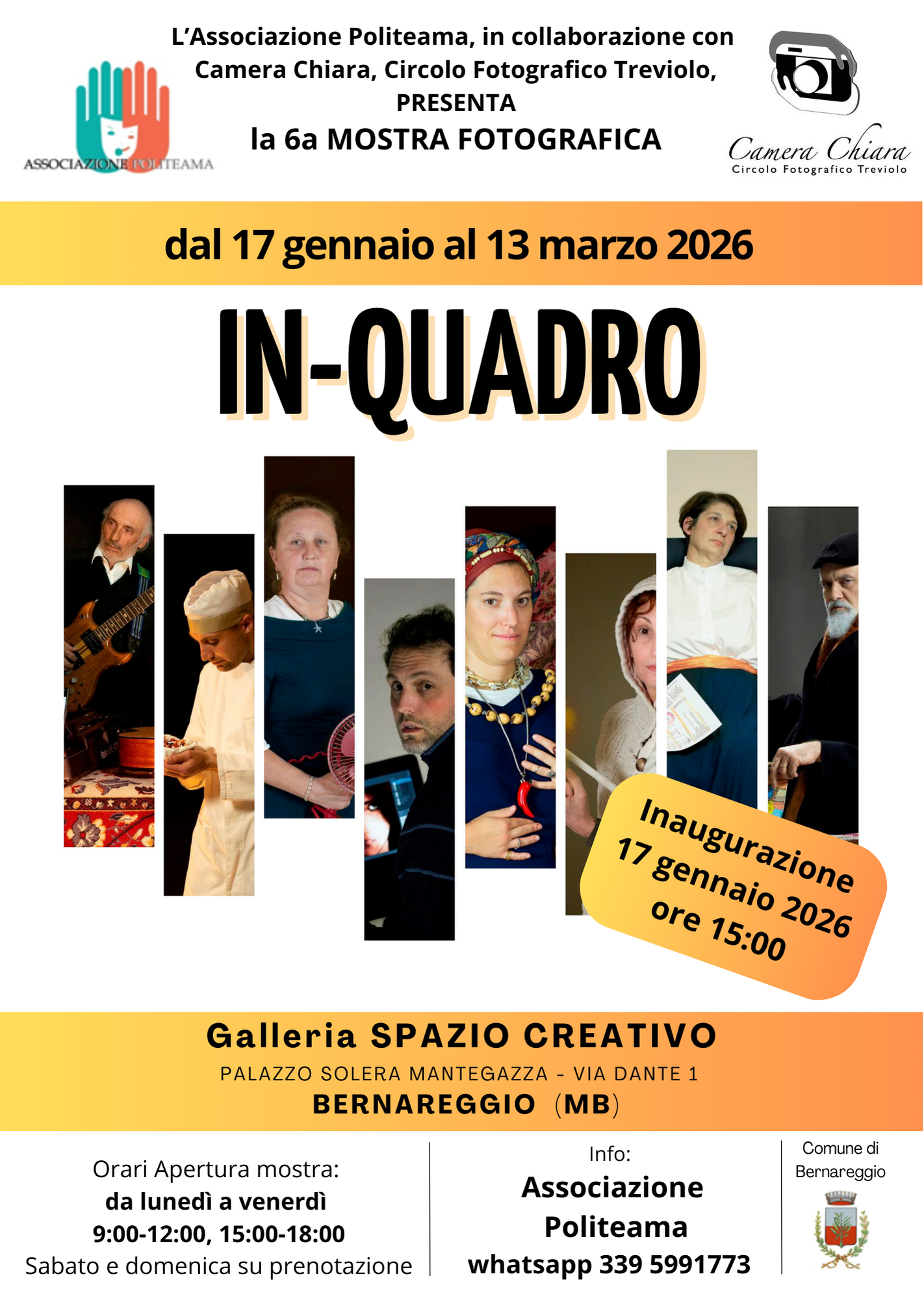 Alle ore 15:00 di sabato 17 Febbraio verrà inaugurata, presso il Palazzo Solera Mantegazza in Via Dante n.1, La 6a Mostra fotografica "In-Quadro", organizzata a cura dell'Associazione Politeama.