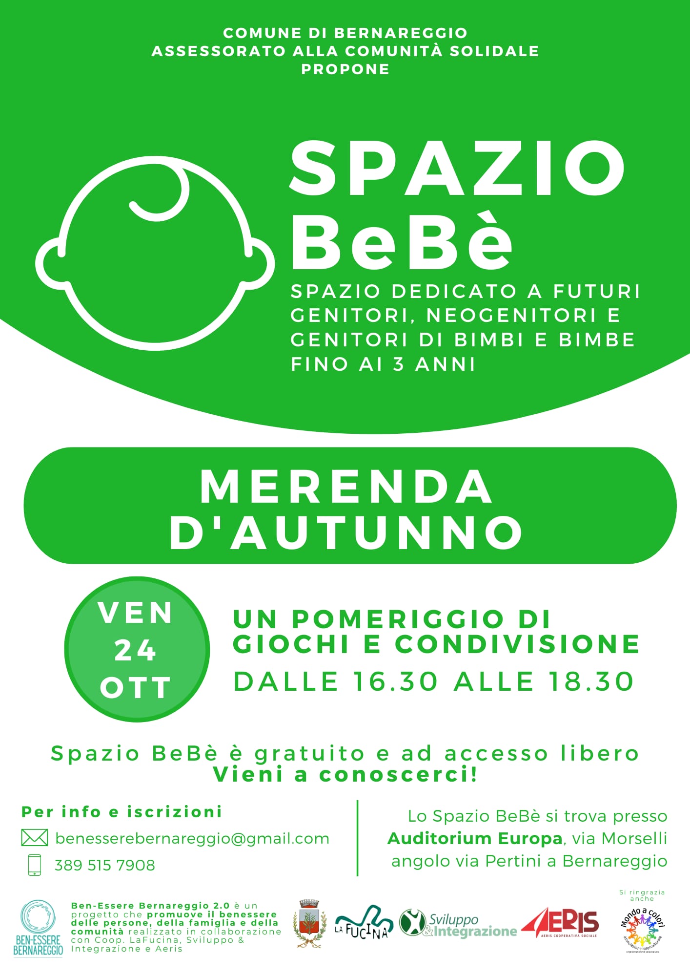 Il Comune di Bernareggio - Assessorato alla Comunità Solidale, invita tutti i futuri genitori, neogenitori e genitori - o altre figure di cura -di bimbi e bimbe fino ai 3 anni a partecipare alla "Merenda d'Autunno" di Spazio BeBè.